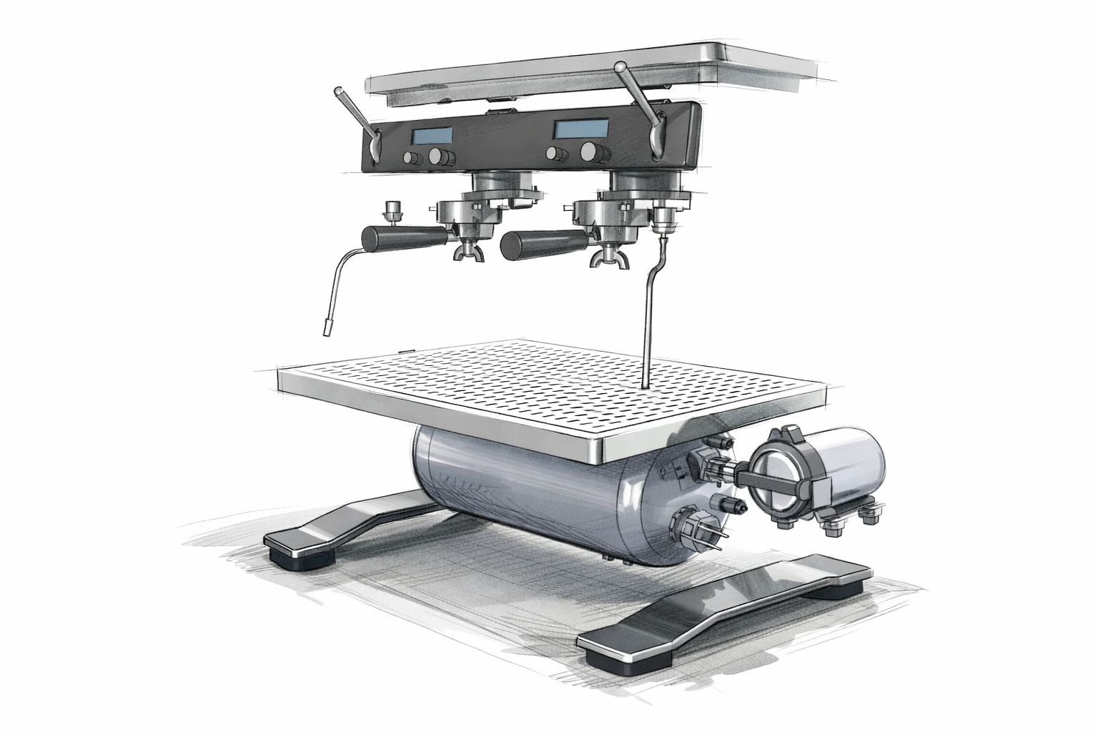 中央開口型專業義式咖啡機,外殼以板金折彎工藝打造,結構穩固線條俐落,也非常方便日常店頭的清潔。